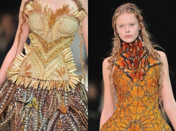 The colours included in this collection were startling, to say the least. With typical shades that are used in the spring summer collections such as pastel or neon thrown out of the window, the House of McQueen has once again stood out in the group, keeping only fresh white to relate to for Spring. The other colours would have been appropriate for the autumn fashions, yet they were used here, and to a surprisingly good effect. Sarah Burton included brocade in rich hues such as amber, red, yellow, gold, dove grey, olive green and beige. As pheasant plumage was used, the shades there had to link in some way to the ones on the designs. She shows that high fashion does not need to relate to anything going on outside, but can just be brilliant and admired through the ideas.