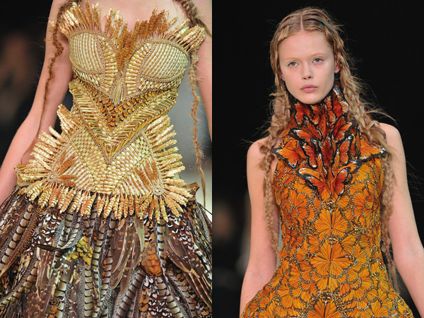 The colours included in this collection were startling, to say the least. With typical shades that are used in the spring summer collections such as pastel or neon thrown out of the window, the House of McQueen has once again stood out in the group, keeping only fresh white to relate to for Spring. The other colours would have been appropriate for the autumn fashions, yet they were used here, and to a surprisingly good effect. Sarah Burton included brocade in rich hues such as amber, red, yellow, gold, dove grey, olive green and beige. As pheasant plumage was used, the shades there had to link in some way to the ones on the designs. She shows that high fashion does not need to relate to anything going on outside, but can just be brilliant and admired through the ideas.