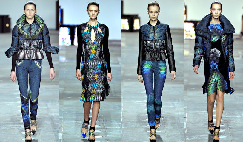 After emerging into the mainstream of fashion last year, the two graduates of Antwerp’s Royal Academy of Fine Arts have stuck their brand high in the list of new and upcoming designers along with Mary Kantrantzou and Christopher Kane. What fascinated me was their vision and inspiration- digitally transforming microscopic images into prints in such a way that they would envelop the woman’s body. Individual and bright, their S/S 2012 collection was painted blue, red, and yellow, and for their A/W 2012/13 collection, they decided to go a bit darker in their aesthetic. I have never seen a company which not only transforms my least fashionable item of clothing in my wardrobe but does it with such style and ease that it seams natural to wear it. Their iridescent patterns and colours inspired by the creatures of the sea (mostly stingrays and jelly fish) create a kingdom where black and blue dominate shot across with yellow, green and white. The classic scarred effect mixed with the cutting of the fabric creates a wonderful geometric pattern both on the puffy jackets and the symmetrical dresses.