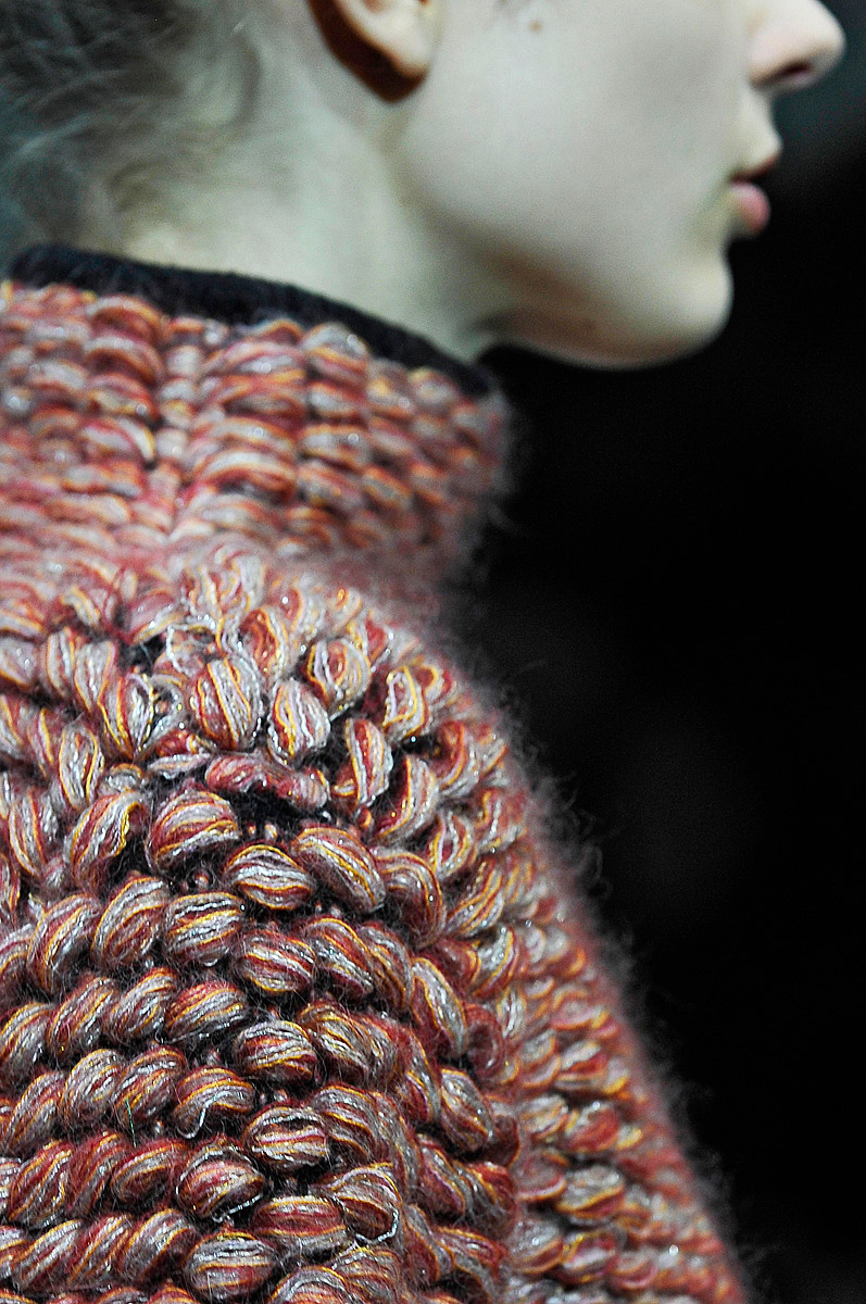 This is also a different side to her creations- truly showing that to be a designer, you need to evolve, not just stay with one aesthetic. Her similarly patterned knits were not as adventurous in the patterns but were works of art visually- with monochrome sleeves and a patterned body, they incorporated a strict elegance into a comfortable knit. This is surely something to point out to the critics who might have questioned her choice of materials for previous collections.