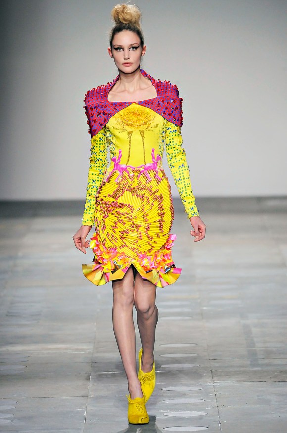 This is certainly the case with Mary Kantrantzou, whose beautiful silk dresses had household kitchen items from Lesange emblazoned into the patterns. With her previous collections, the designer had not strayed away from brights, and with this A/W collection she did not bend to the ‘all-black’ rule- once again, there was grass green, yellow, red and blue. With spoons surrounding the cuffs, is this a completely different fashion style?